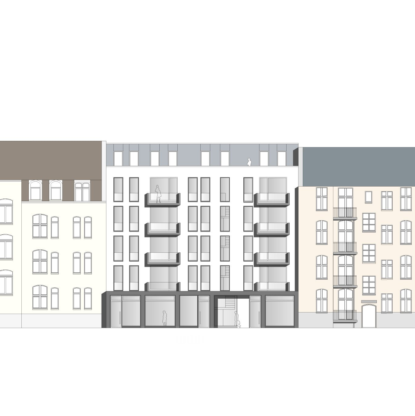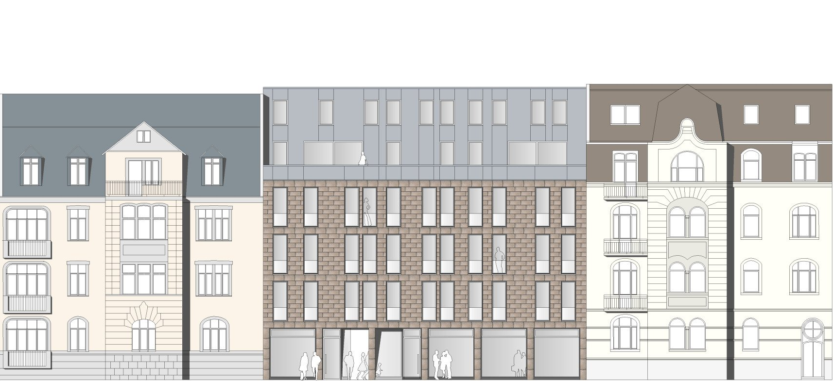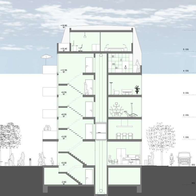 Die vorgefundene Blockrandstruktur wurde nach dem Wiederaufbau (2. Weltkrieg) nicht vollständig wiederhergestellt, sodass sich die Bauaufgabe mit der Neubesetzung der Lücke und Verbindung der historischen Bestandsgebäude beschäftigt. Das neue Objekt erhält in der EG-Zone eine Büroeinheit und ein Café. In den oberen Etagen sind unterschiedliche Wohnungsgrößen vorgesehen.