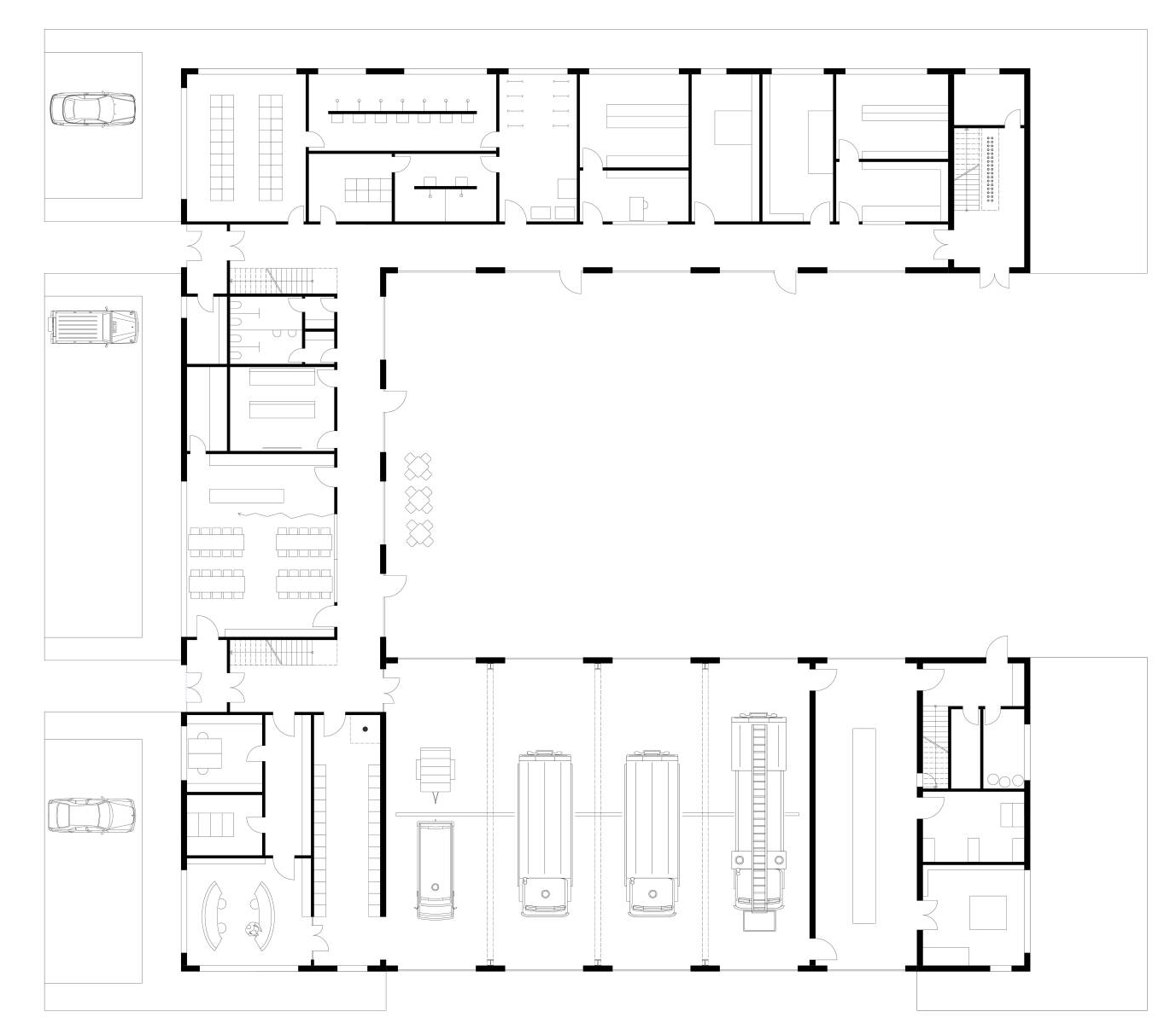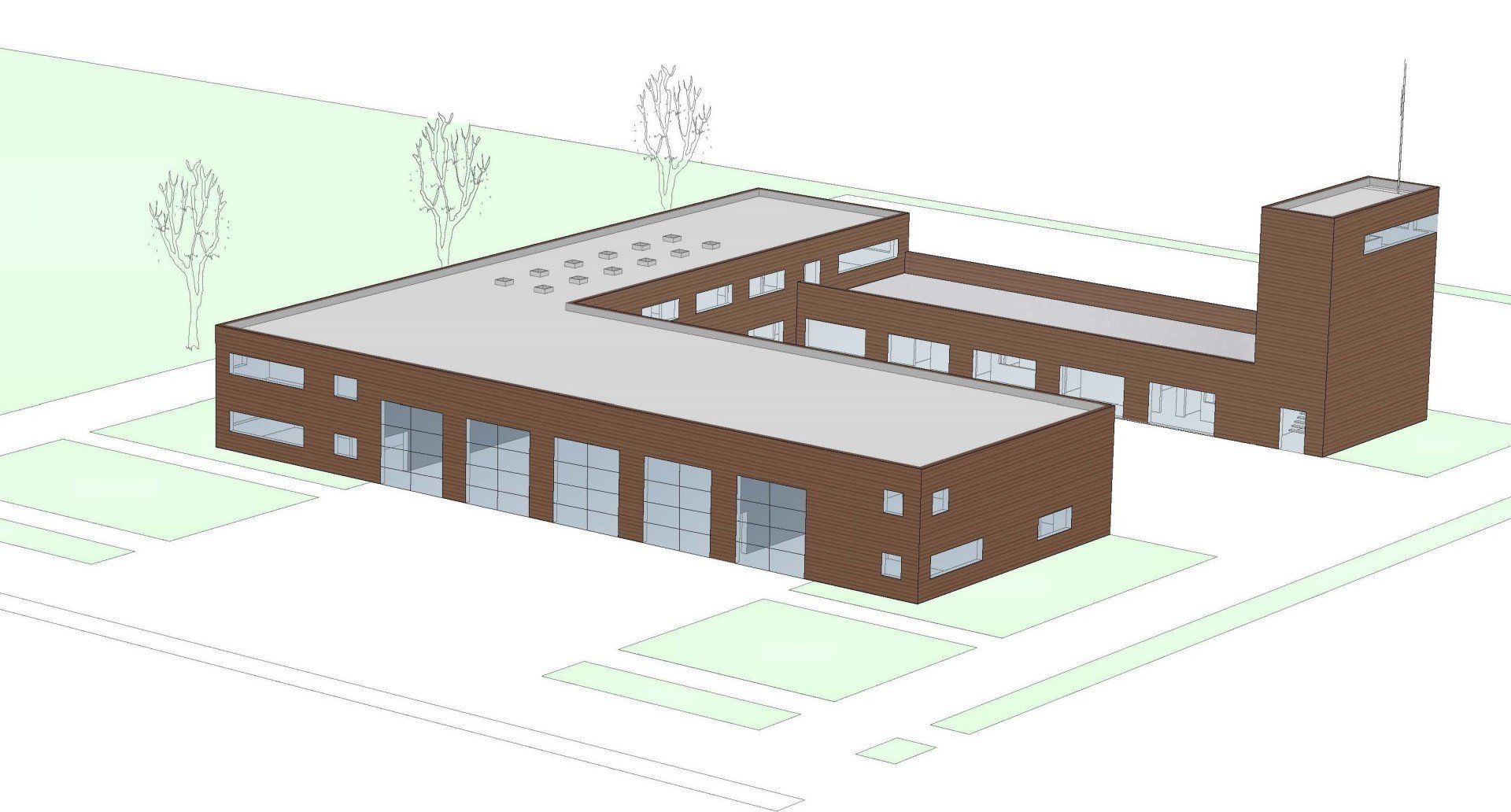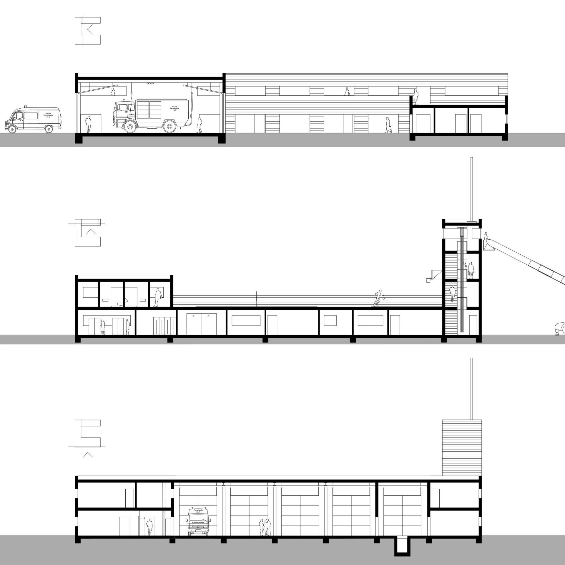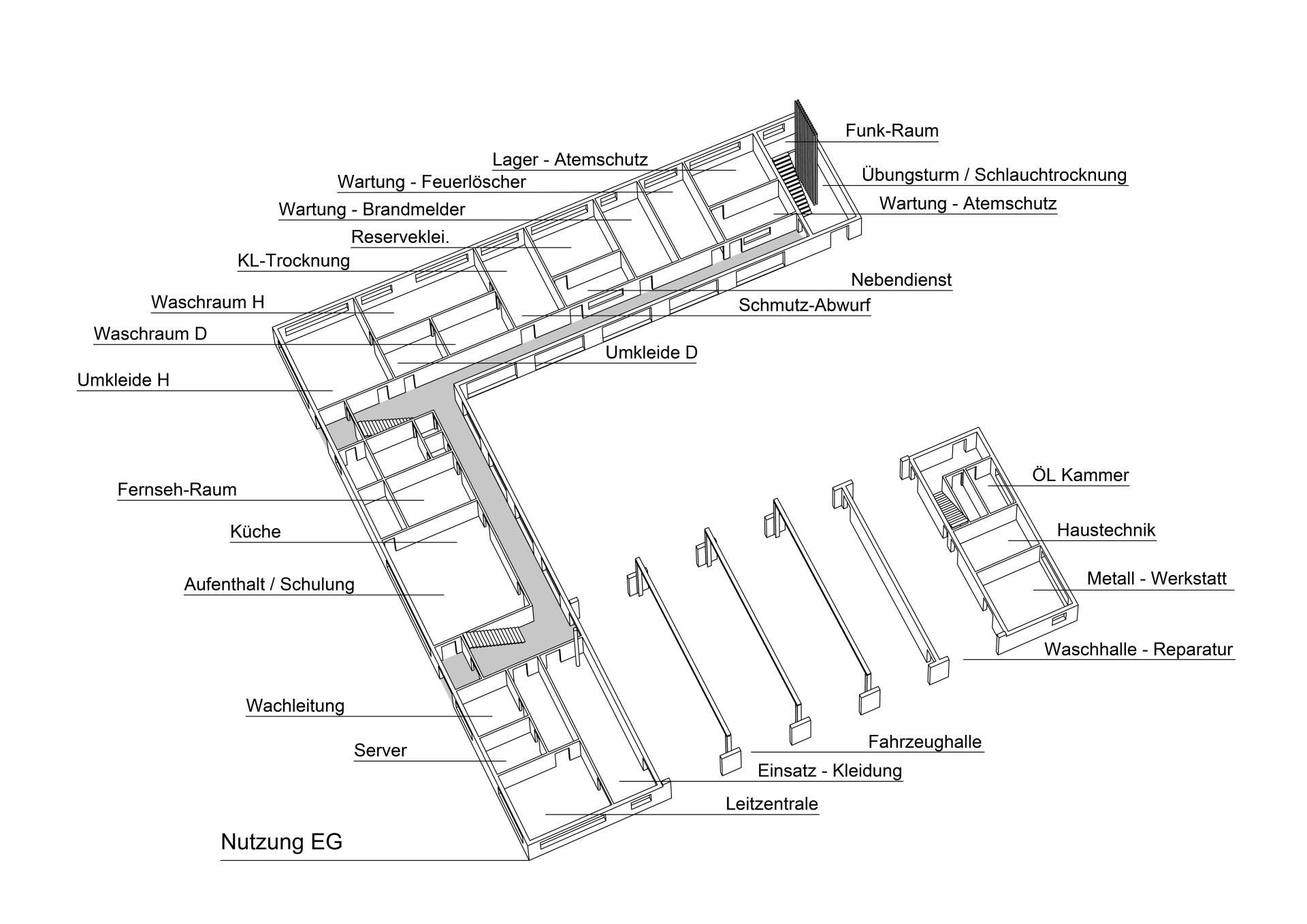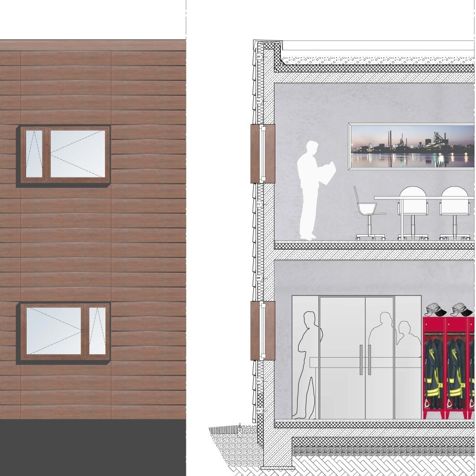 Bei dem Projekt handelt sich um eine Konzeption für eine Werkfeuerwehr die im 24 Stundenbetrieb die Unterkunft für die Mannschaft beinhalten, sowie die Fahrzeug-halle mit einem Einsatzleitwagen ELW, zwei Löschfahrzeugen HLF, einer Drehleiter DLA und eine separate Waschhalle.