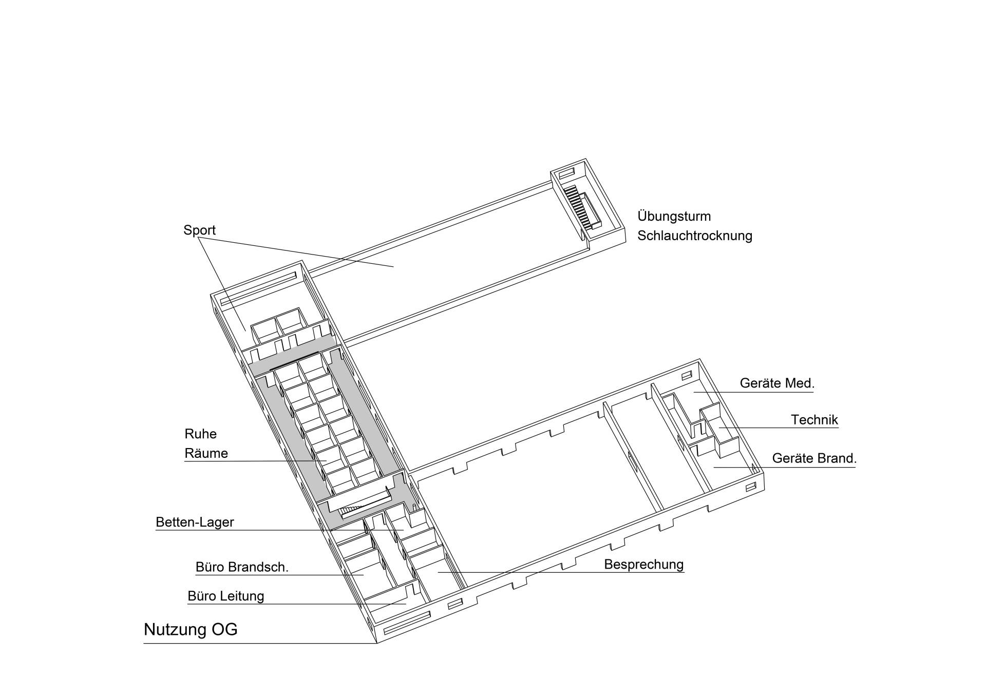 In dem Objekt wurden zudem die Rettungsleitstelle und die Nebenräume bestehende aus Fitnesscenter, Prüfstelle für Handfeuerlöscher und Beatmungsgeräte integriert. Das Raumkonzept wurde durch die Planung eines Treppenturm für Übungszwecke abgerundet.