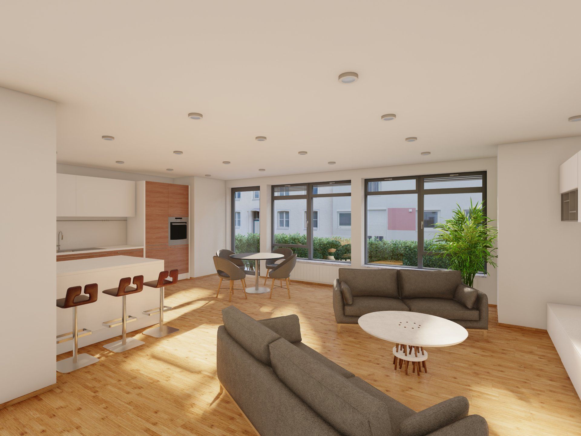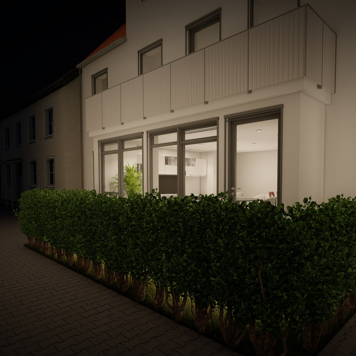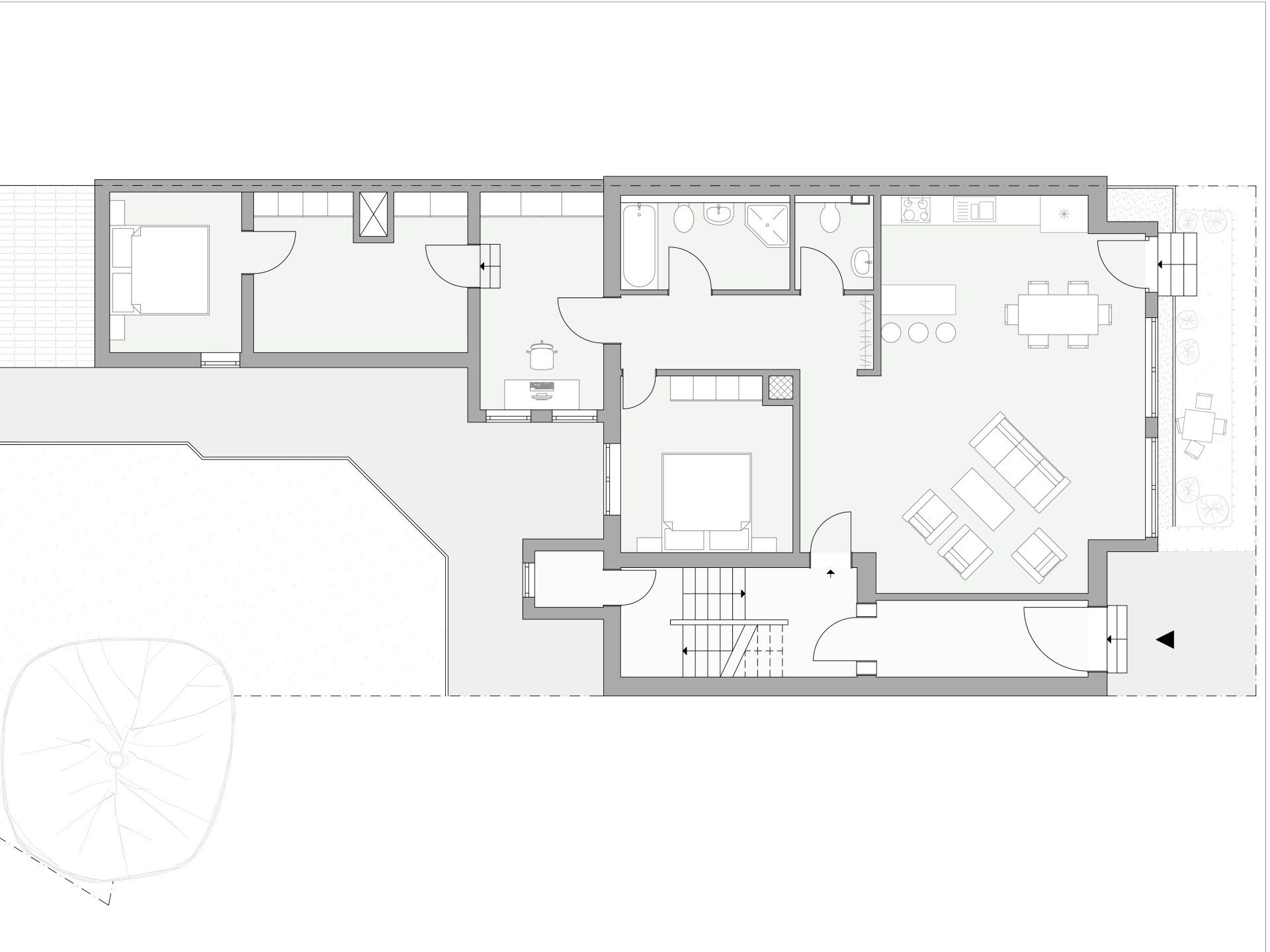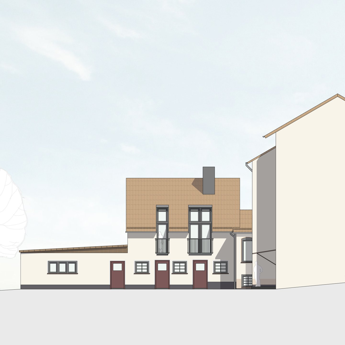 Das um 1910 erbaute Haus soll neben der langjährigen Nutzung als Wohn- und Geschäftshaus, nun als reines Wohnhaus umfunktioniert werden. Der im Erdgeschoss gelegenen Laden mit eigenem Zugang und die angrenzende, leerstehende Scheune werden nun umgebaut und der Grundriss neu umstrukturiert. Die in den Fünfzigern zusätzlich erbaute große Ladenfront, soll auch weiterhin bestehen bleiben, um das Wohn- und Esszimmer optimal zu belichten. Um die Vorfläche attraktiver zu gestalten und einen Abstand zum öffentlichen Raum zu gewinnen, wird diese teilweise begrünt und eingefriedet, somit entsteht ein zusätzlicher Freisitz.